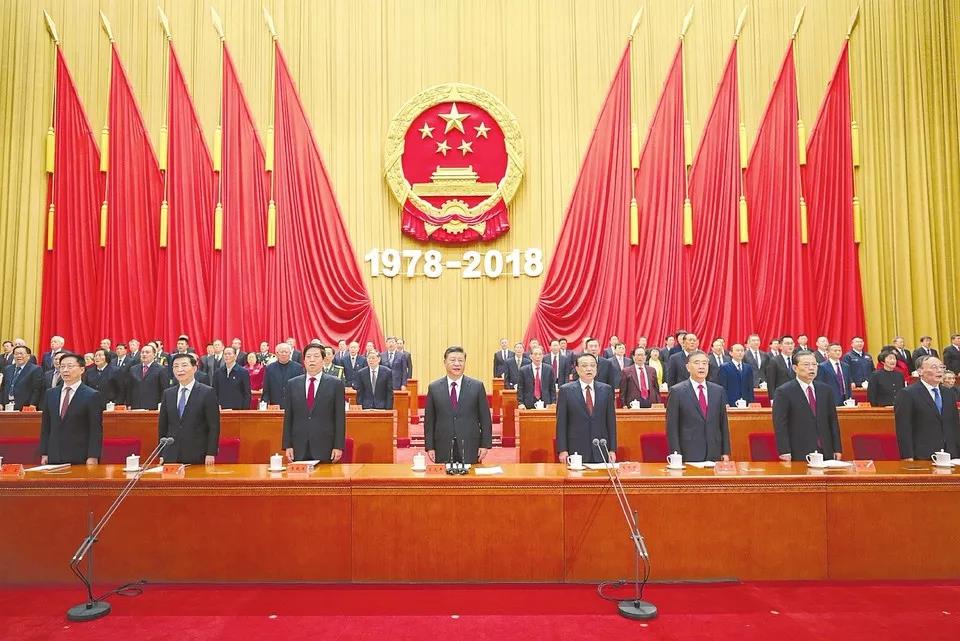 人民大會(huì)堂雄偉莊嚴(yán),萬(wàn)人大禮堂燈火輝煌、氣氛熱烈。主席臺(tái)上方懸掛著“慶祝改革開(kāi)放40周年大會(huì)”會(huì)標(biāo),后幕正中是中華人民共和國(guó)國(guó)徽和“1978-2018”字標(biāo),10面紅旗分列兩側(cè)。