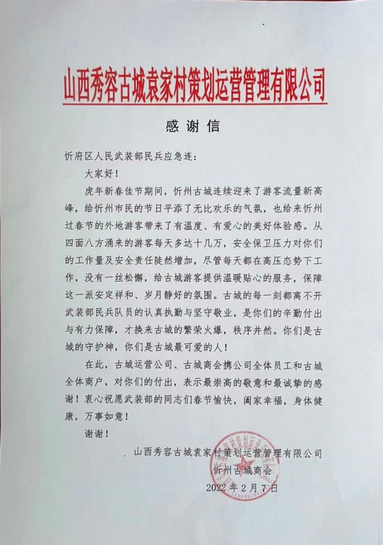 感謝信中,山西秀容古城袁家村策劃運(yùn)營管理有限公司和忻州古城商會對物業(yè)公司民兵應(yīng)急連在春節(jié)期間面對古城客流量增大,隊(duì)員們堅(jiān)守崗位,圓滿完成安保任務(wù)給與了充分肯定和表示了崇高敬意,并致以衷心感謝和衷心祝愿!