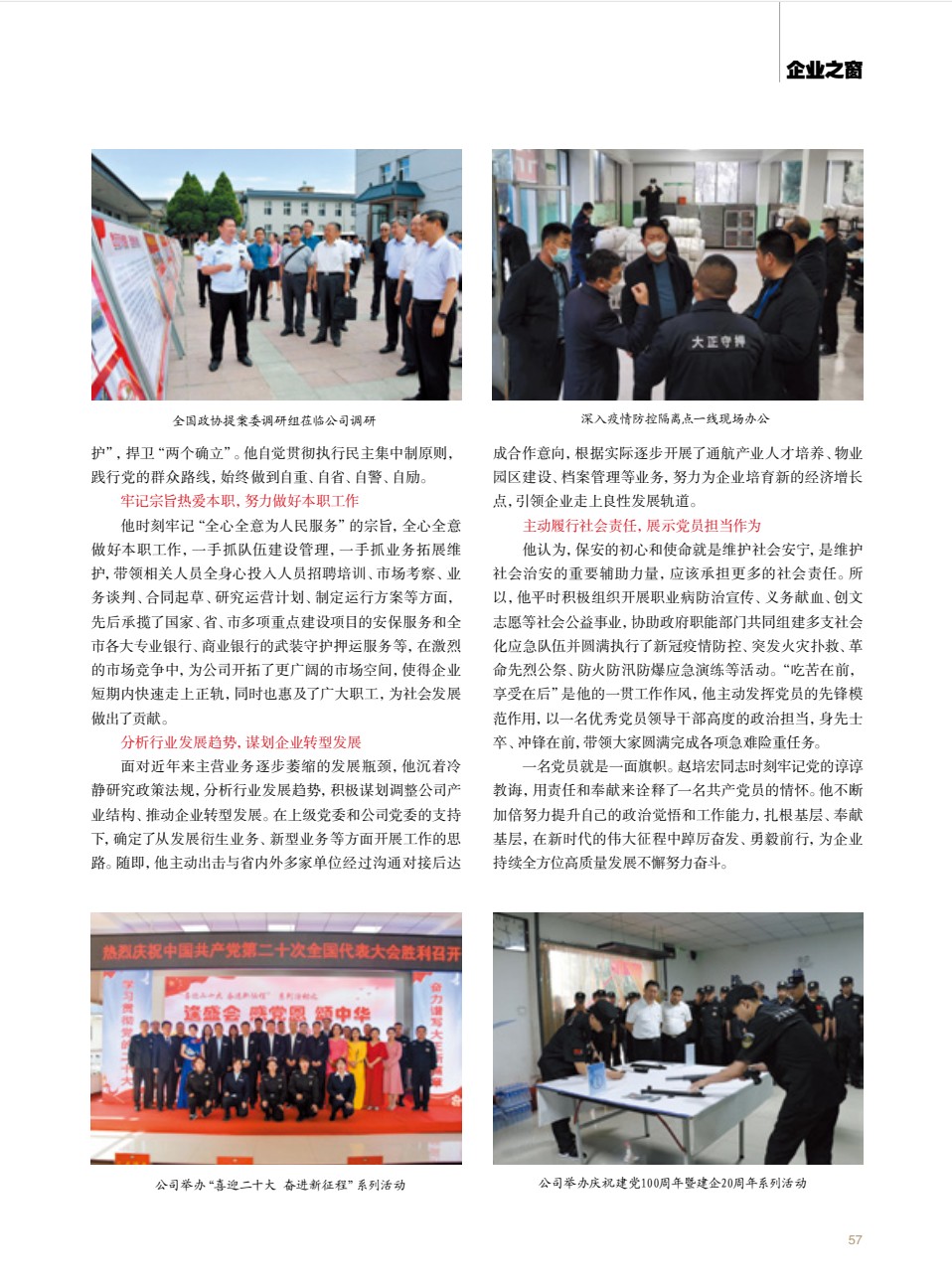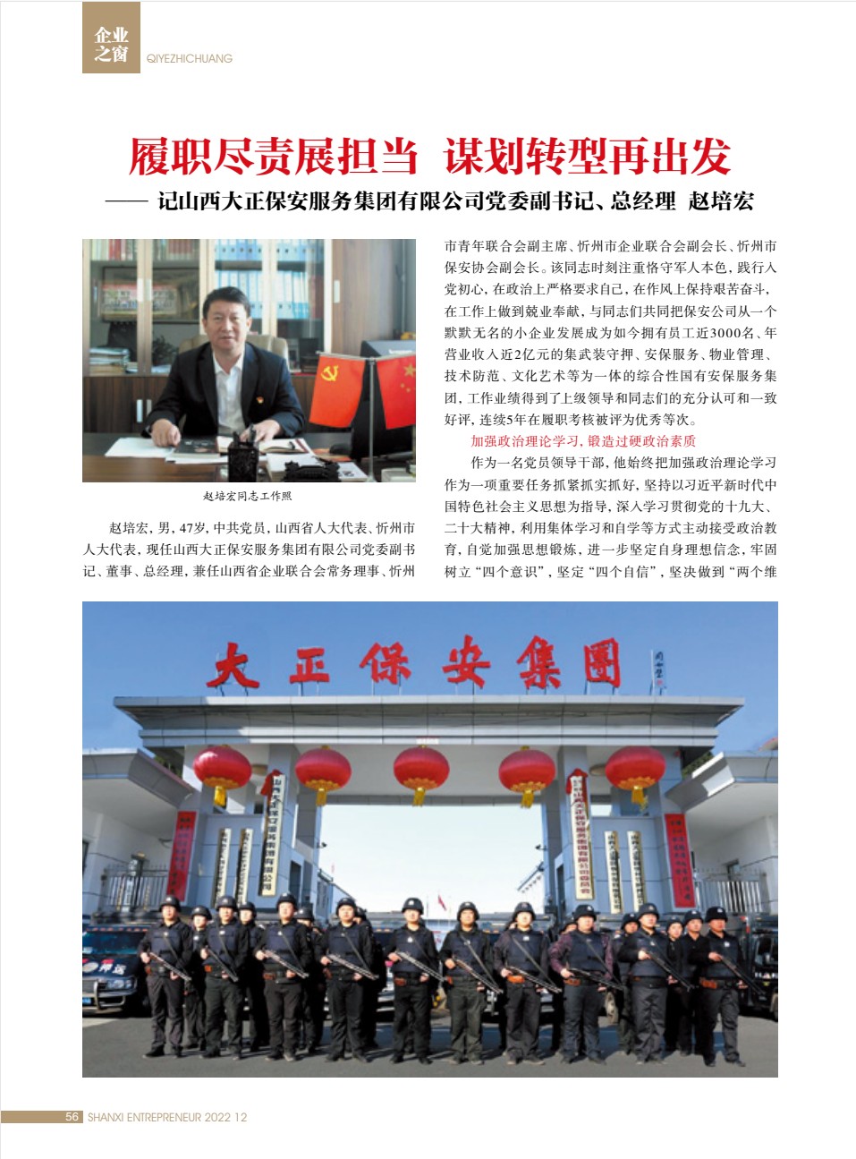 近日,《山西企業(yè)家》雜志第40期(2022年12月號)以《履職盡責(zé)展擔(dān)當(dāng)謀劃轉(zhuǎn)型再出發(fā)》為題,刊發(fā)了對山西大正保安服務(wù)集團有限公司黨委副書記、總經(jīng)理趙培宏的專題報道: