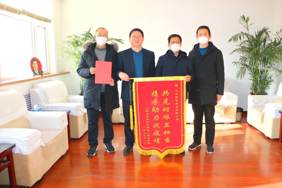 1月9日上午,忻府區(qū)法院黨組成員、副院長黃偉,黨組成員、政治部主任焦旭林帶著寫有“共克時(shí)艱顯擔(dān)當(dāng) 攜手助力戰(zhàn)疫情”的錦旗和一封感謝信來到了山西大正保安服務(wù)集團(tuán)有限公司,表達(dá)對(duì)保安公司在疫情防控中無私無畏、甘愿付出的誠摯謝意。大正保安集團(tuán)公司黨委副書記、總經(jīng)理趙培宏、黨委委員、副總經(jīng)理王明生接洽。自2022年11月6日忻府區(qū)突發(fā)疫情以來,山西大正保安服務(wù)集團(tuán)有限公司駐忻府區(qū)法院勤務(wù)點(diǎn)的隊(duì)員們?cè)陉悤詵|隊(duì)長的帶領(lǐng)下,積極響應(yīng)疫情防控各項(xiàng)要求,除在保障法院關(guān)鍵時(shí)期平穩(wěn)運(yùn)行外,保安公司職員還能夠挺身而出,積極投身防疫點(diǎn)值守、后勤保障、車輛運(yùn)行、機(jī)關(guān)防疫消殺等方面,以實(shí)際行動(dòng)為忻府區(qū)法院疫情防控及機(jī)關(guān)安保工作做出了突出貢獻(xiàn)。越是緊要關(guān)頭,越能映照初心;越在關(guān)鍵時(shí)刻,越顯擔(dān)當(dāng)使命。面對(duì)突如其來的疫情“大考”,大正保安集團(tuán)積極響應(yīng)號(hào)召,主動(dòng)、迅速地配合我院防疫部署,精心服務(wù)群眾、嚴(yán)格執(zhí)行命令、防范意識(shí)到位,助力織密織牢疫情防控網(wǎng),充分展示了大正保安人的職業(yè)素養(yǎng)與責(zé)任擔(dān)當(dāng)。幾年來,山西大正保安服務(wù)集團(tuán)有限公司駐區(qū)法院全體職員,以法院為家,服從工作需要,積極參與各項(xiàng)審判事業(yè),做到聞令而動(dòng),成為不可或缺的中堅(jiān)力量,為法院跨越式發(fā)展提供了巨大支持。