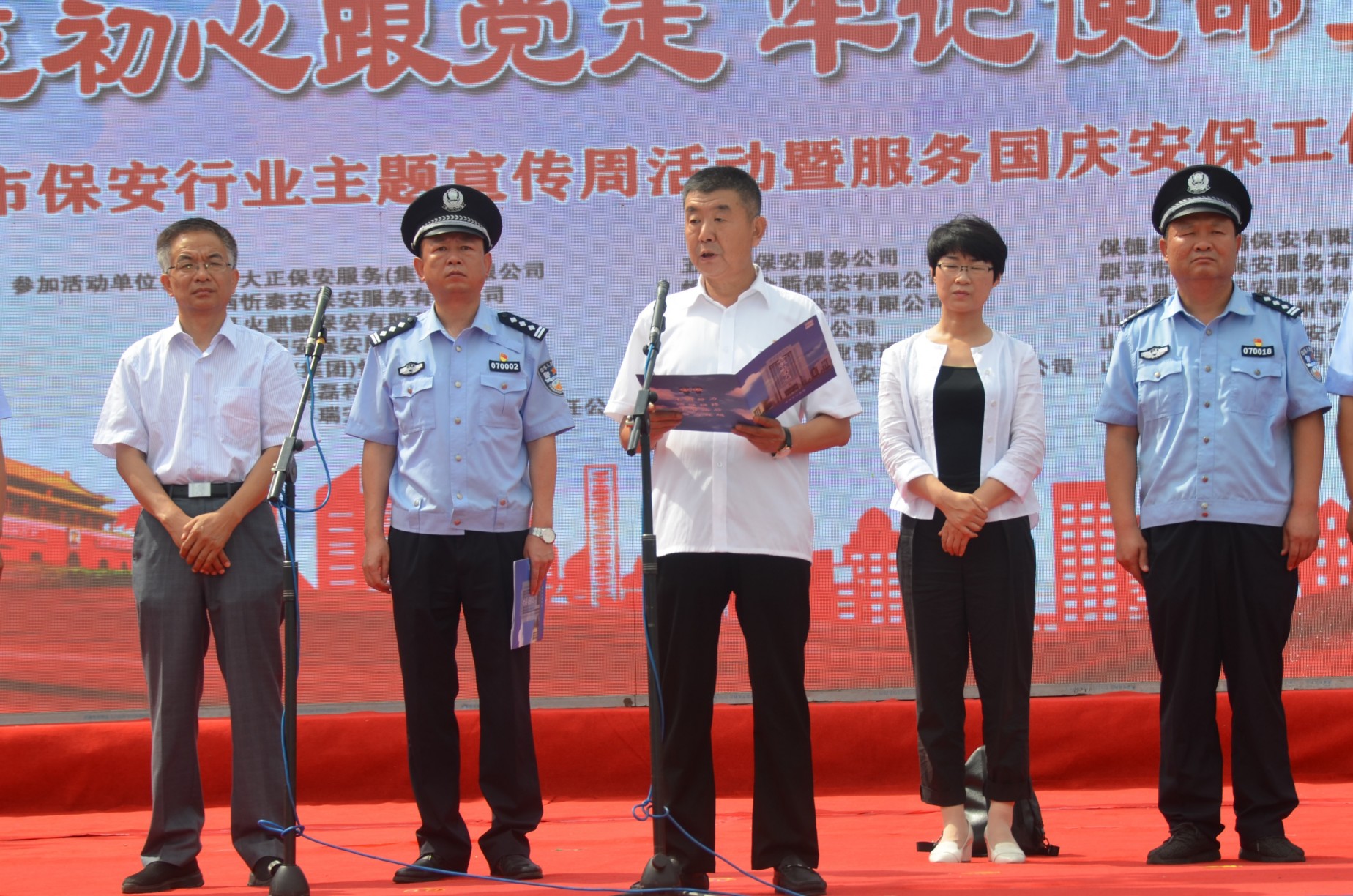 市保安協(xié)會(huì)會(huì)長、山西大正保安服務(wù)有限公司黨委書記、董事長張躍生作動(dòng)員講話,要求全市廣大保安企業(yè)和保安員要認(rèn)真落實(shí)市公安局、市保安協(xié)會(huì)安排部署,統(tǒng)一思想認(rèn)識(shí)、提高政治站位,進(jìn)一步增強(qiáng)使命感、責(zé)任感和緊迫感,創(chuàng)新工作思路、拓寬活動(dòng)形式、豐富活動(dòng)內(nèi)容、深化活動(dòng)內(nèi)涵,廣泛開展安全防范宣傳、志愿服務(wù)和崗位練兵等工作,用實(shí)際行動(dòng)為“平安忻州”建設(shè)添磚加瓦,為“二青會(huì)”成功舉辦增光添彩,為新中國70周年大慶保駕護(hù)航。