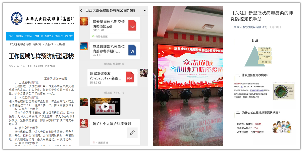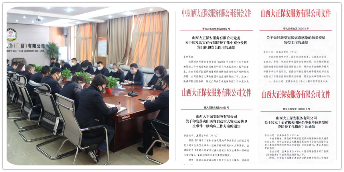 新型冠狀病毒肺炎疫情爆發(fā)以來,山西大正保安服務(wù)有限公司堅決貫徹黨中央、國務(wù)院決策部署,深入貫徹省委、省政府,市委、市政府和市國資委安排部署,認真落實“堅定信心、同舟共濟、科學(xué)防治、精準施策”的總要求,根據(jù)企業(yè)實際情況周密安排部署,多措并舉扎實推進企業(yè)疫情防控工作。