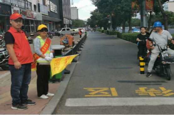 紅燈亮起,停車線邊的工作人員便舉起手中的小旗,向行人與車輛作出停止示意,并對(duì)停車位置有誤的電動(dòng)車做出指揮和引導(dǎo),對(duì)搶行、闖紅燈等不遵守交規(guī)的行人進(jìn)行制止;對(duì)年紀(jì)較大、腿腳不便的居民,志愿者主動(dòng)攙扶,護(hù)送其安全的過馬路。在志愿者的文明勸導(dǎo)下,行人闖紅燈現(xiàn)象明顯減少,車輛和行人安全有序通行,道路交通安全暢通。