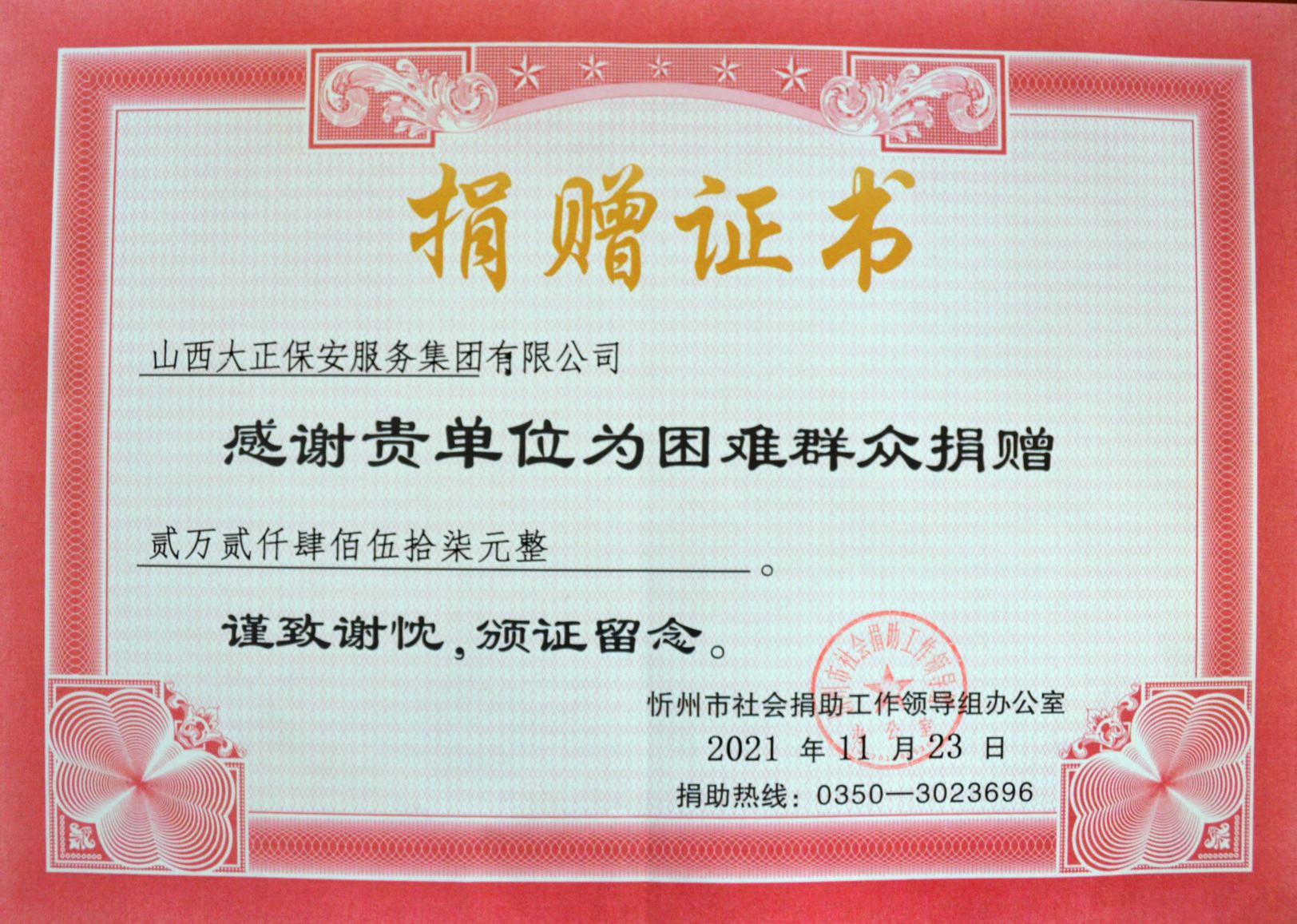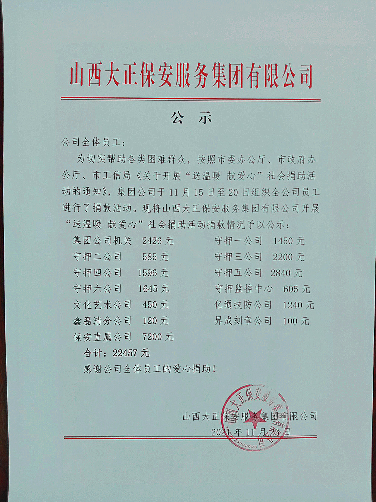 11月15日,集團(tuán)公司組織領(lǐng)導(dǎo)班子成員及總部駐地全體員工在大會議室參加了社會捐助活動。本次捐助活動,彰顯了山西大正保安集團(tuán)廣大員工的奉獻(xiàn)擔(dān)當(dāng)精神,也激發(fā)了公司全體員工扶危濟(jì)貧的愛心,在全公司上下營造了無私奉獻(xiàn)、助人為樂的濃厚氛圍。