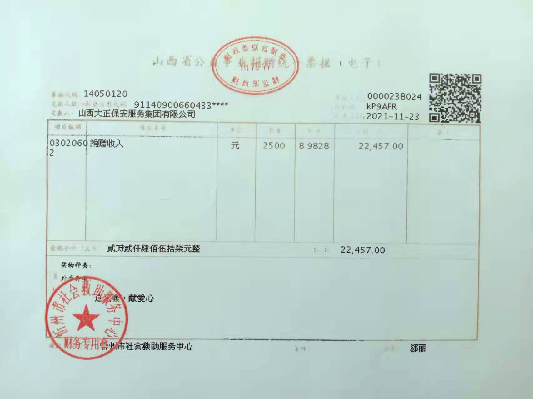 與此同時(shí),公司基層各級黨組織和黨員領(lǐng)導(dǎo)干部充分發(fā)揮表率作用,帶頭宣傳動員,帶頭捐款獻(xiàn)愛心,以實(shí)際行動影響和帶動廣大干部職工在各所屬駐地相繼踴躍開展、參與了捐助活動。一筆筆捐款,代表著山西大正保安集團(tuán)廣大職工的一份份愛心,詮釋著大正保安人對社會的拳拳愛心,短短幾天時(shí)間,我公司共收到員工社會捐款22457元。