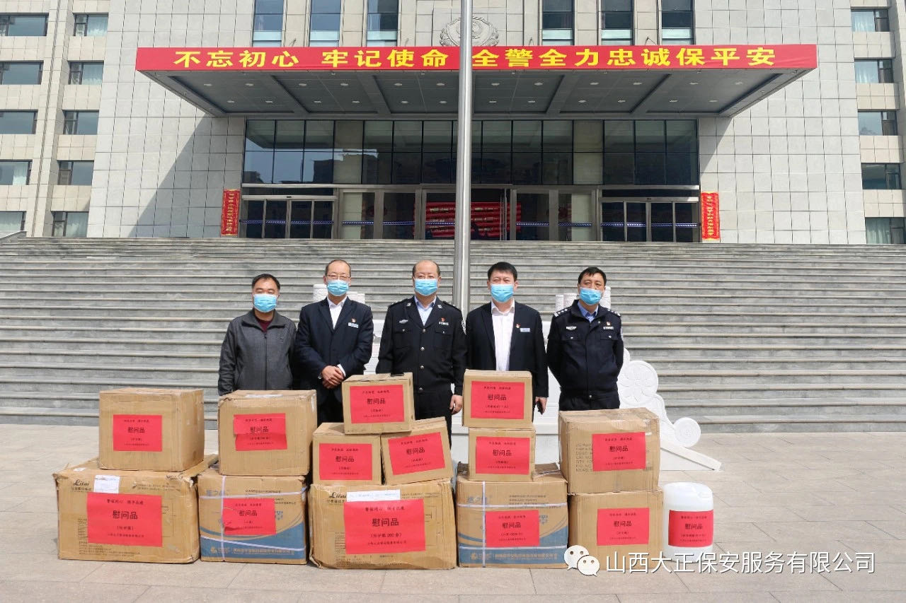 3月31日,山西大正保安服務(wù)(集團(tuán))有限公司黨委委員、副總經(jīng)理趙培宏、副總經(jīng)理王明生領(lǐng)導(dǎo)一行,專程來到市公安局,捐贈(zèng)了醫(yī)用口罩12000、防護(hù)服200套、護(hù)目鏡500個(gè)、消毒液80㎏、醫(yī)用酒精25㎏,表達(dá)公司和干部職工對(duì)公安民警疫情防控的支持;對(duì)警保同心、聯(lián)手抗疫的信心、決心;對(duì)廣大公安民警健康的關(guān)愛。忻州市公安局副局長王雷接過物資后,代表市局對(duì)大正集團(tuán)公司的捐贈(zèng)表示感謝。
