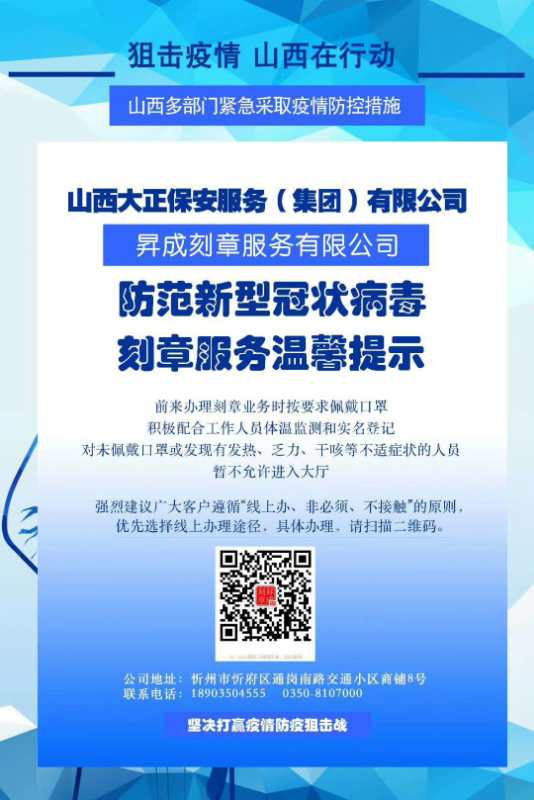 疫情期間,山西大正昇成刻章服務(wù)有限公司積極響應(yīng)集團公司號召,在做好防疫工作的同時,以線下線上齊發(fā)力的方式動員全體員工積極拓展新業(yè)務(wù),靈活應(yīng)對疫情帶來的不便影響,保質(zhì)保量完成業(yè)務(wù)目標。